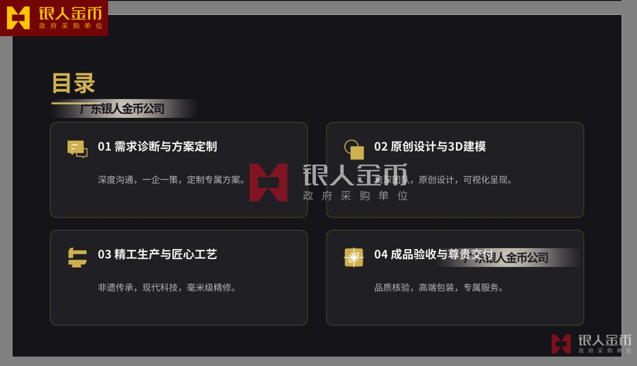 廣東銀人金幣公司針對高端客群對獨特性的追求,提供深度的個性化定制服務(wù).基于客戶需求,結(jié)合黃金制品與企業(yè)文化元素,定做獨一無二的專屬珍品,極大提升了企業(yè)的價值感和尊崇感!